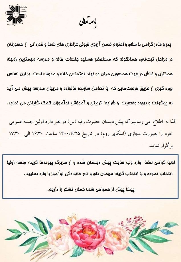 دعوتنامه ی اولین جلسه ی عمومی اولیا