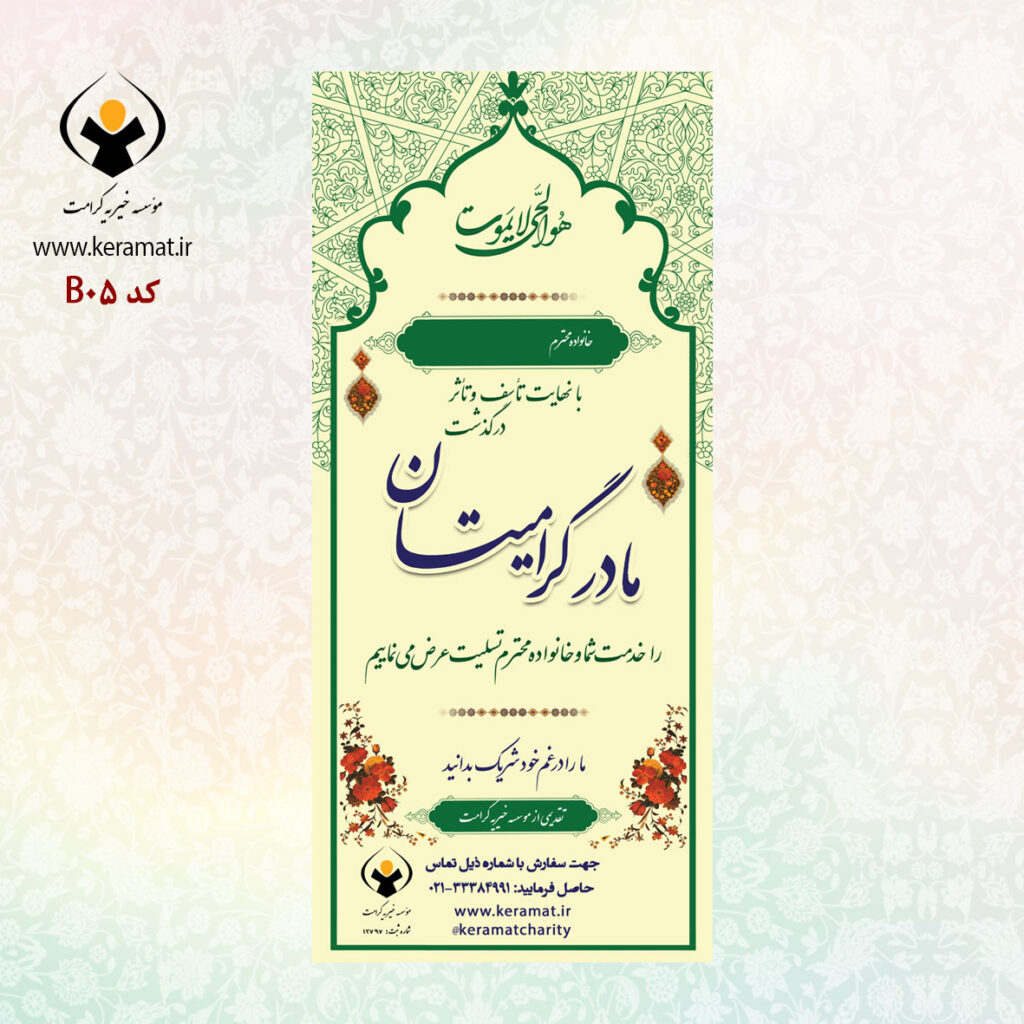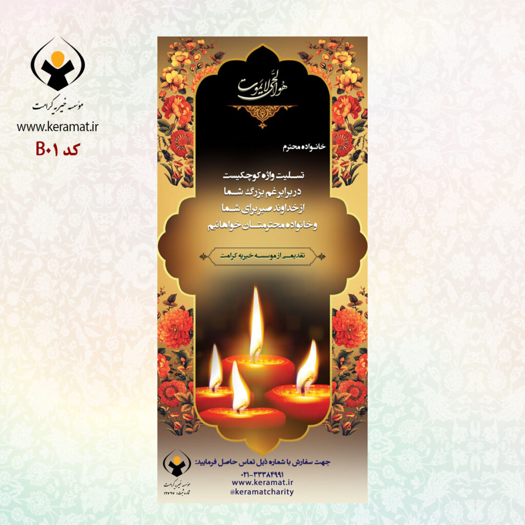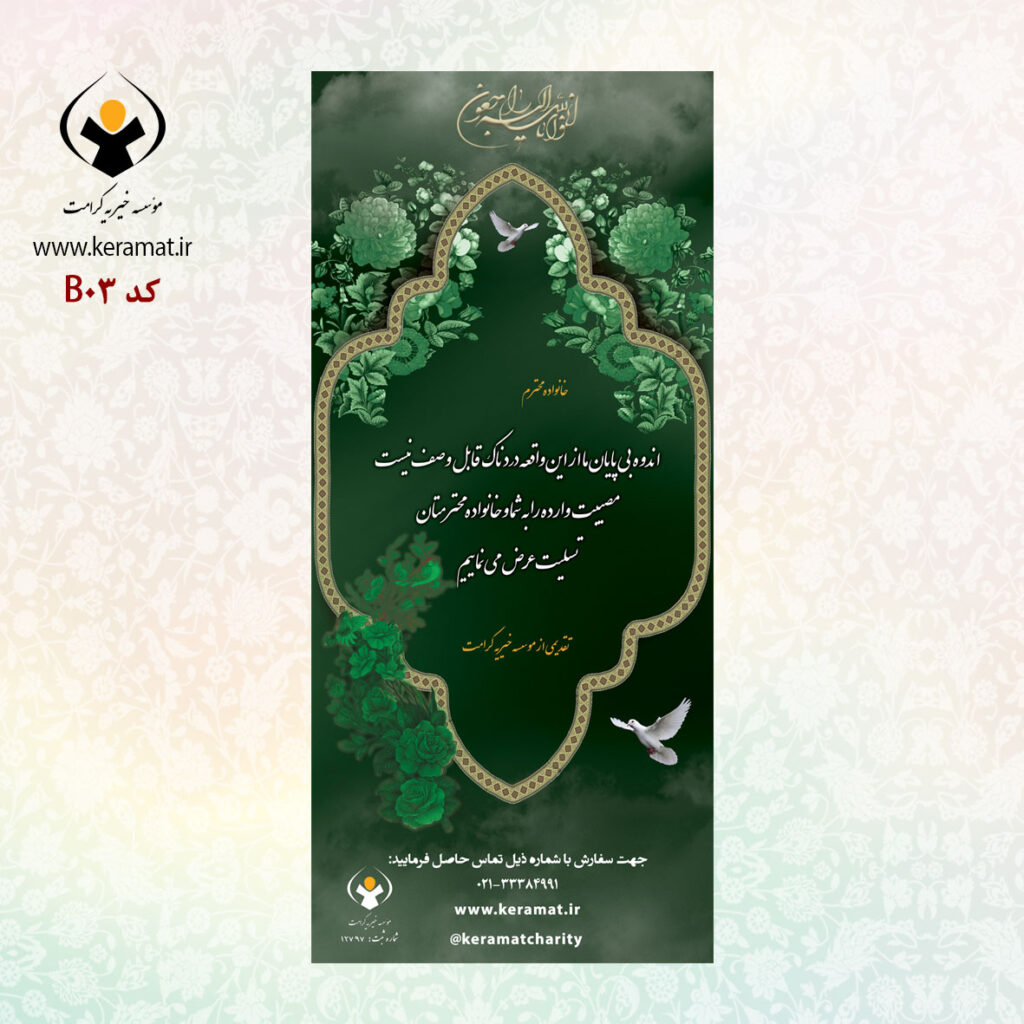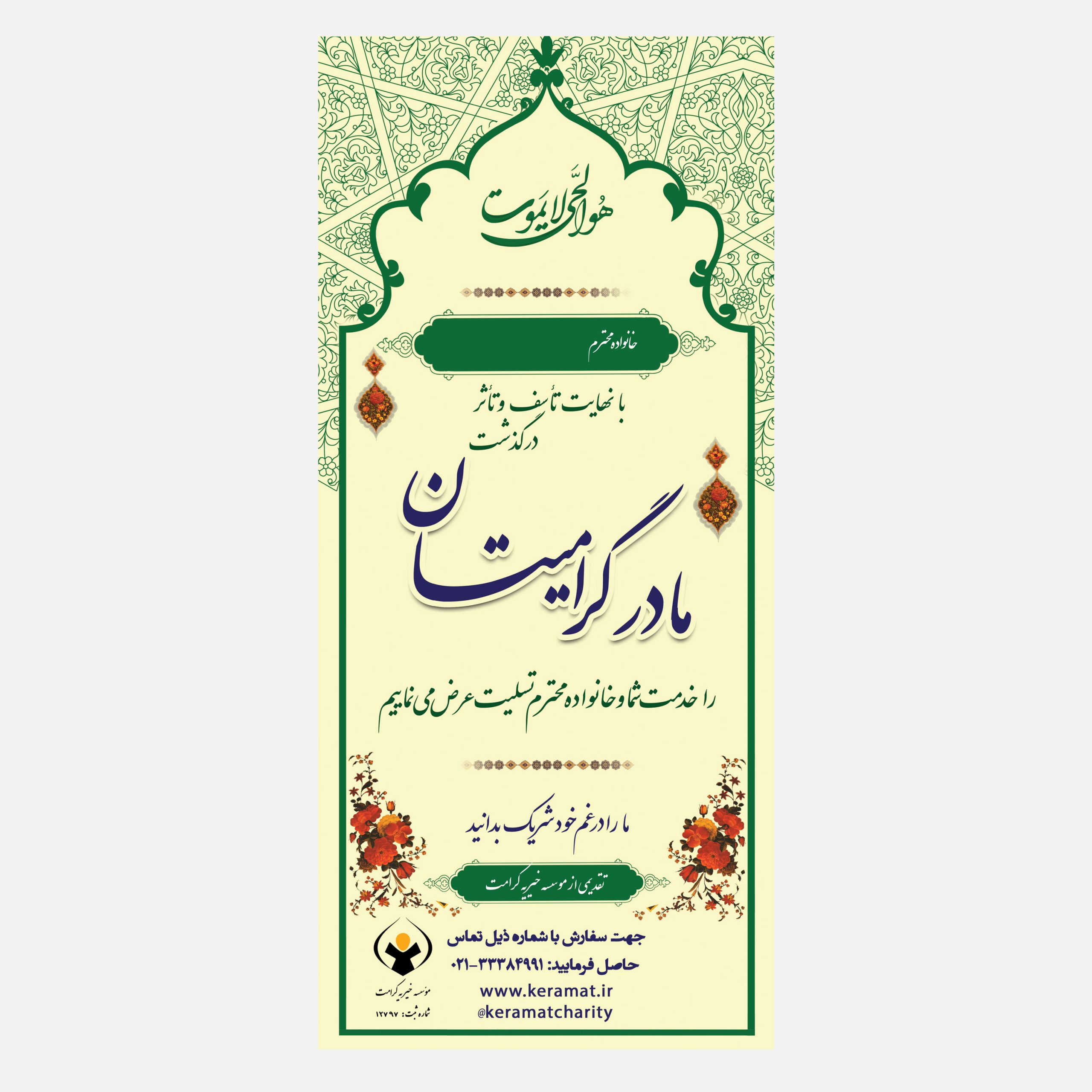 بنرهای تسلیت موسسه خیریه کرامت به صورت اختصاصی در موسسه خیریه کرامت طراحی و تهیه می شوند و هزینه سفارش آن ها به ۳۰۰ نفر از مددجویان تحت پوشش اختصاص داده می شود. با مشارکت در کار، در ترویج این فرهنگ سهیم باشیم.